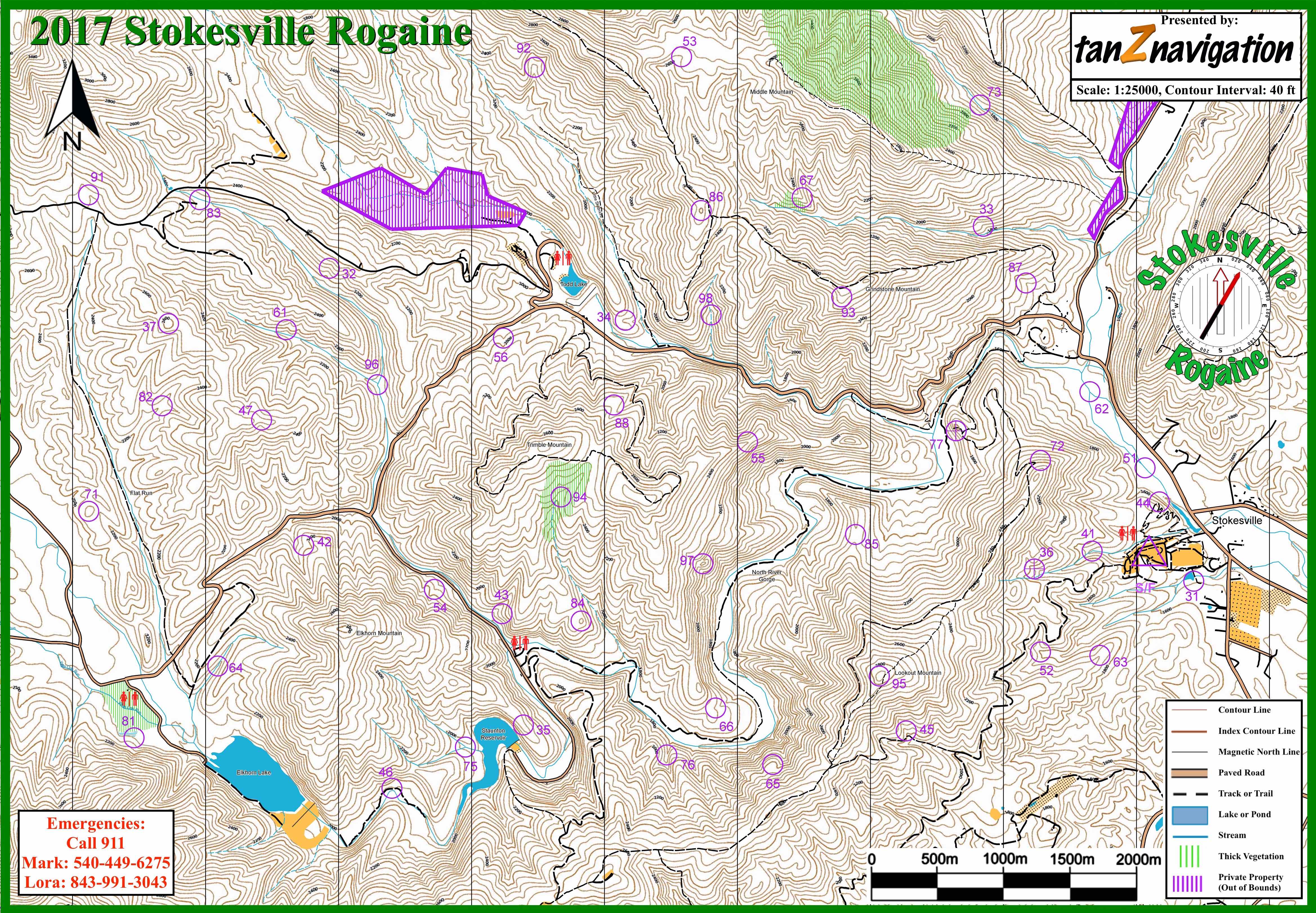 A 1:24000 map for the 2017 Stokesville rogaine, generated from LiDAR data, water resource data, and Open Street Map, as well as some custom GPS tracks. |
