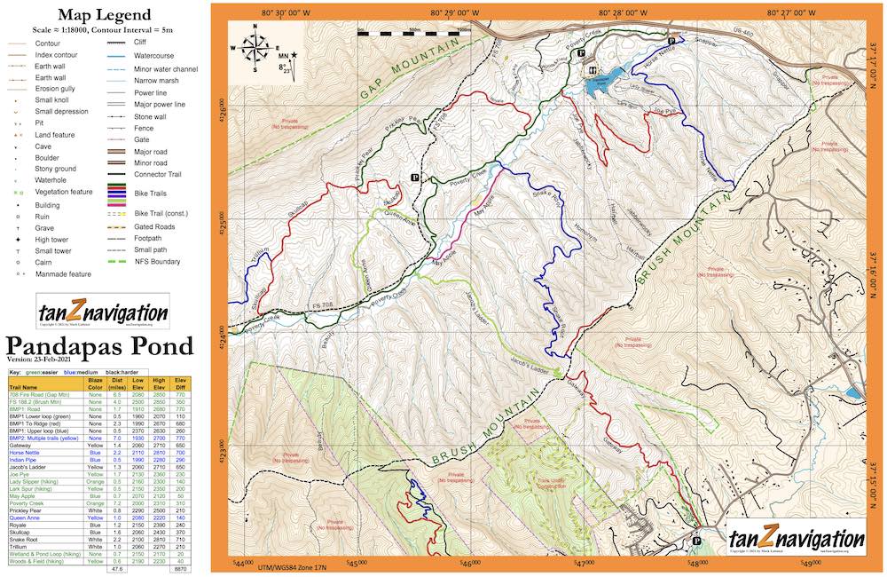 A 1:18000 double-sided hiking/cycling map of the Pandapas Pond and Brush Mountain trail systems.