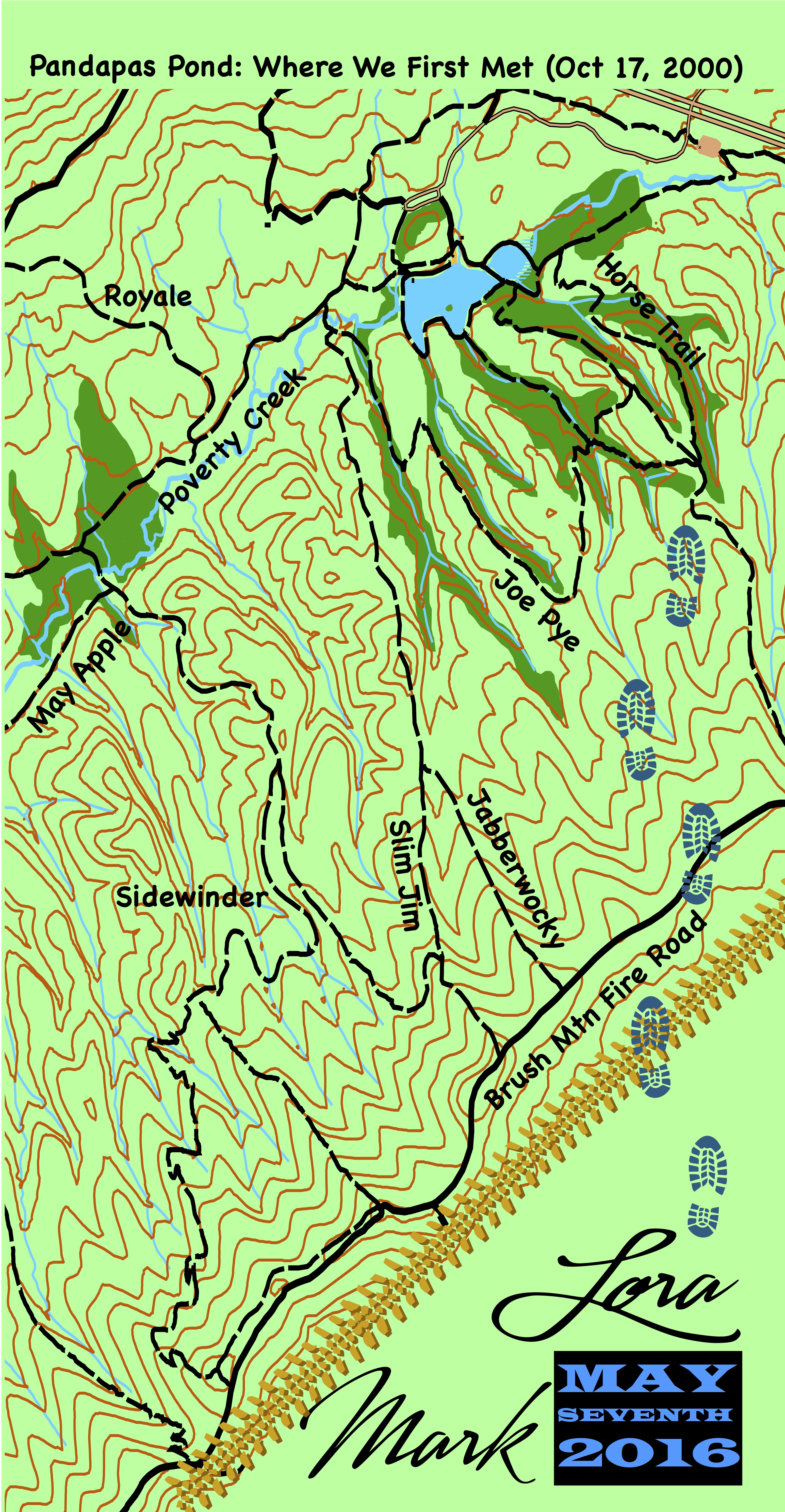 A stylized map of Pandapas Pond made into a buff for Mark/Lora wedding guests |