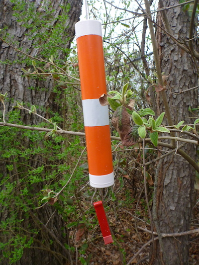 We've built a course located at Mountain Lake near Pembroke, Virginia (directions). It consists of 25 controls to find. But, you don't have to find them all. All you need to walk/run a course is the orienteering course map and a compass. You also might want to bring some water and food. Each of the points has an orange and white control (see picture) with a word written on it. These controls are a bit more weather proof than standard orienteering flags.