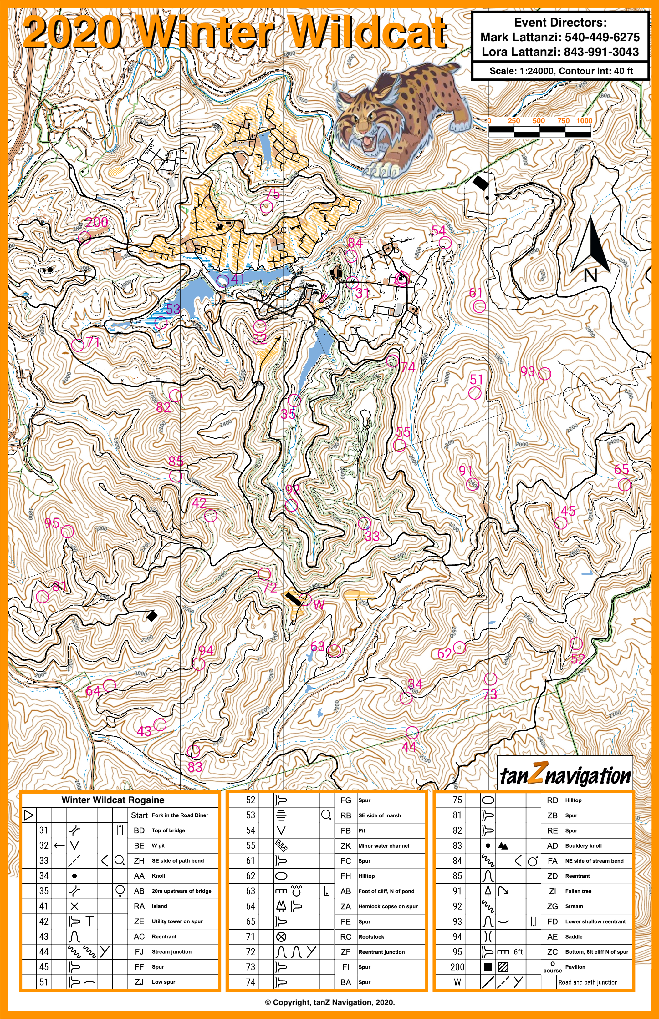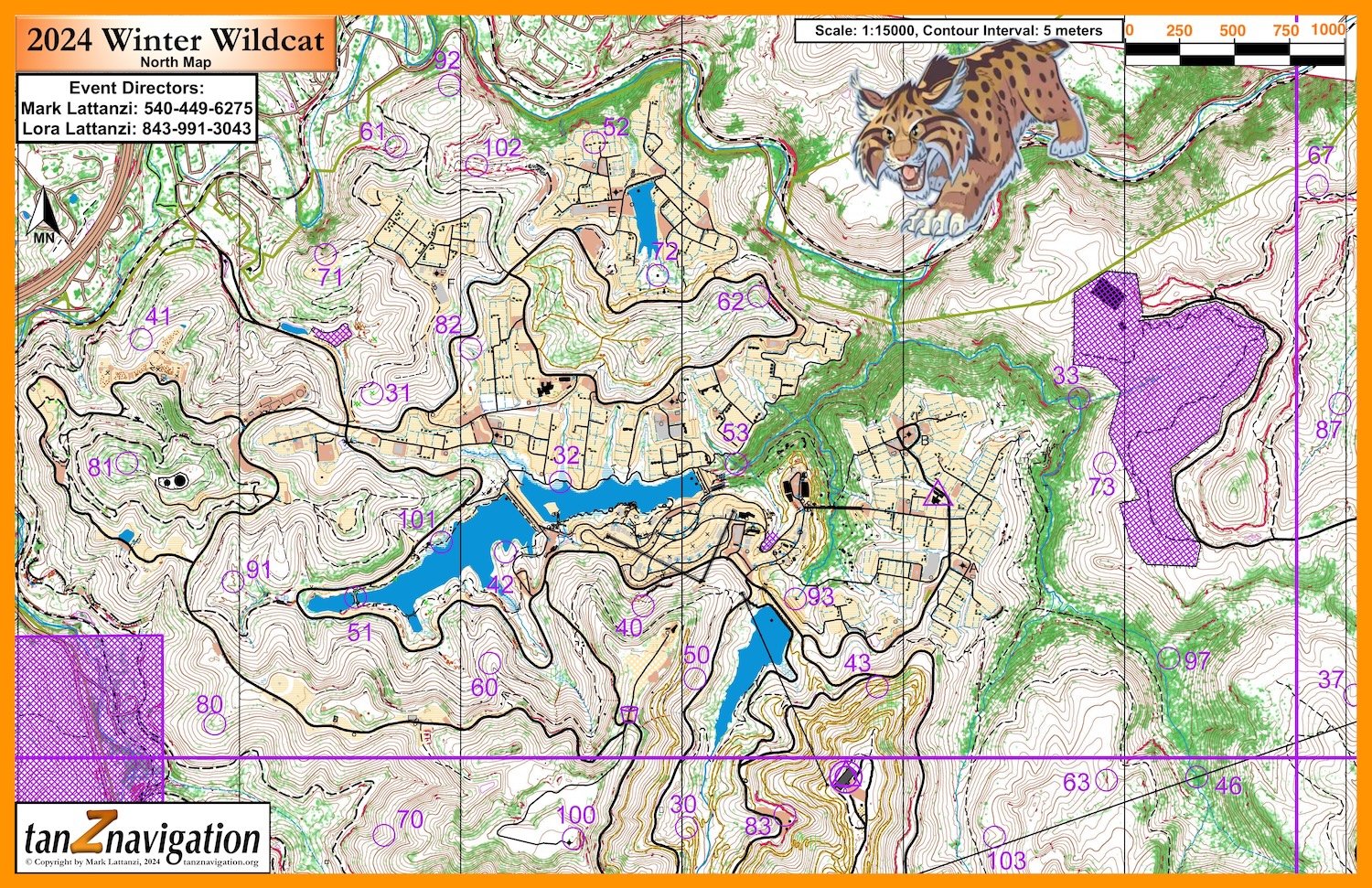 A 1:24000 map for the 2020 Winter Wildcat rogaine, generated from LiDAR data, water resource data, and Open Street Map, as well as some custom GPS tracks. |